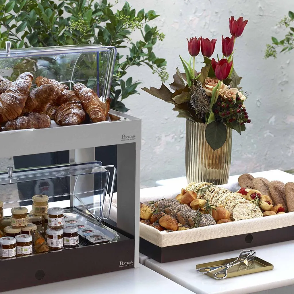 Porta pane, porta formaggi, distributori per bevande calde o succhi, e sistemi refrigeranti per presentare in tavola yogurt, burro ed affettati: ogni accessorio ha il preciso compito di dare un aspetto ordinato alla tavola ed esaltare l’immagine della qualità dei cibi proposti.