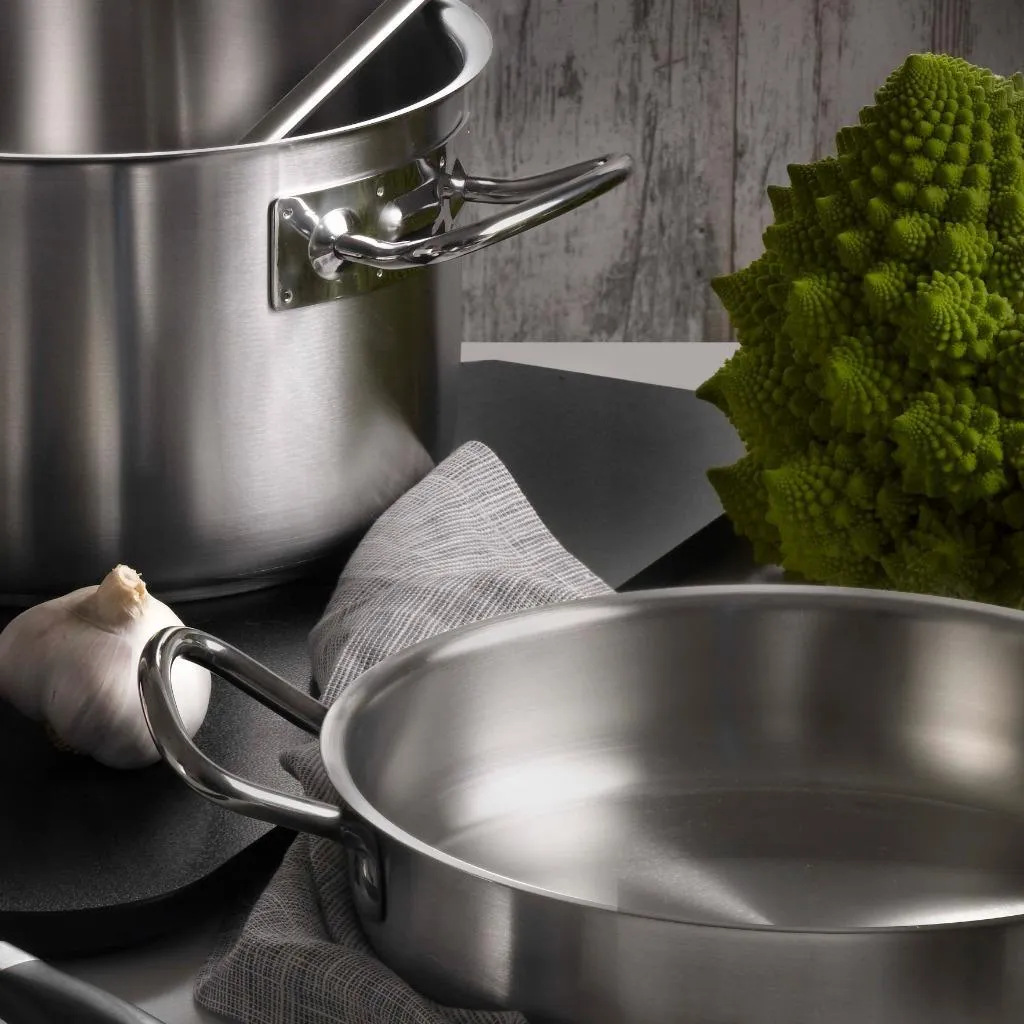 Le nostre linee sono in acciaio inossidabile, ma anche in rame, ferro, alluminio (crudo ed antiaderente) e trimetallo. Proponiamo gamme complete, comprensive di pentole e colapasta, padelle, tegami, paioli, bollilatte, teglie e casseruole da 8 fino a 60 cm di diametro. Ed ancora griglie, rostiere, bistecchiere, pentole a pressione, wok e molto altro, a soddisfare tutte le possibile esigenze di una cucina industriale.